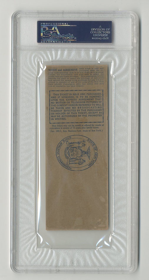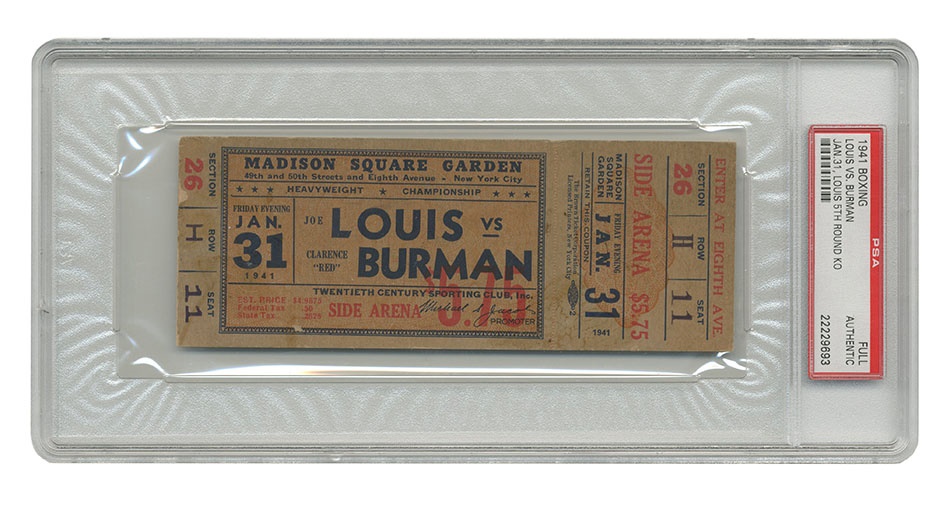 On January 31, 1941 at Madison Square Garden in New York world heavyweight champion Joe Louis fought Clarence "Red" Burman with the title on the line. Louis knocked Burman out in the 5th round with a body punch. Offered here is an original, full, unused ticket for this event. This full ticket includes the names of both fighters, venue, date and section, row and seat number. Exhibits some edge and surface wear. Overall VG condition. Authenticated by PSA/DNA. One of the rarer full boxing tickets from Joe Louis championship run.