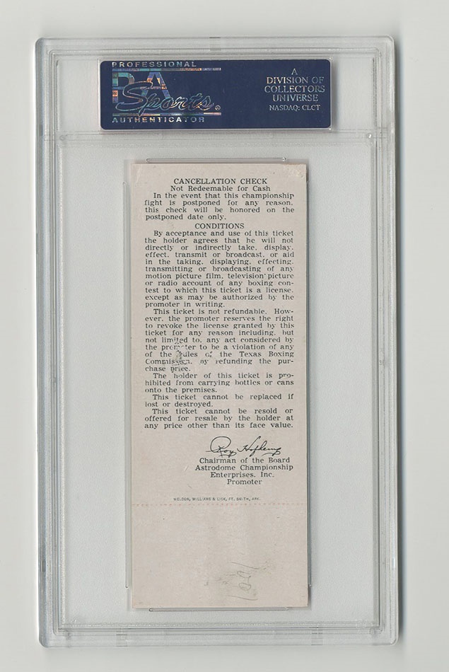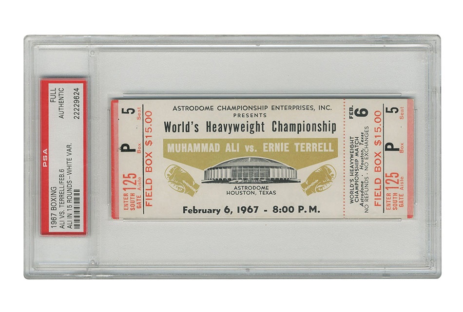 On February 6,1967 Muhammad Ali put his title on the line against Ernie Terrell at the Astrodome in Houston, Texas. Ali would continually taunt Terrell and win a unanimous 15 round decision. The fight was originally scheduled for March 29, 1966, but was postponed until the following year. Offered here is an extremely rare, original, full, unused ticket for this event. This original ticket used for the exact day of the fight is in overall EX condition with no creasing. Includes section, row and seat number. Authenticated by PSA/DNA. This is one of the very few full tickets from this fight to have been offered at public sale.