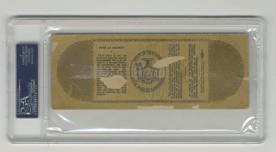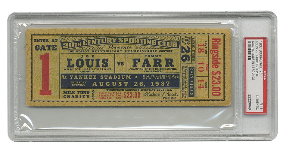 Joe Louis fought Tommy Farr on August 30, 1937 at Yankee Stadium in New York. It was Louis' first defense of the world heavyweight title he won from Jimmy Braddock months earlier. Farr proved a tough opponent, but Louis prevailed winning by 15 round decision. Presented here is an original, full, unused ticket for this event. This full ticket names both fighters and includes a section, row and seat number. Bold color and print. Stub firmly attached. Clean. Not creased or torn. Minor edge and surface wear. Overall EX condition. Authenticated by PSA/DNA.