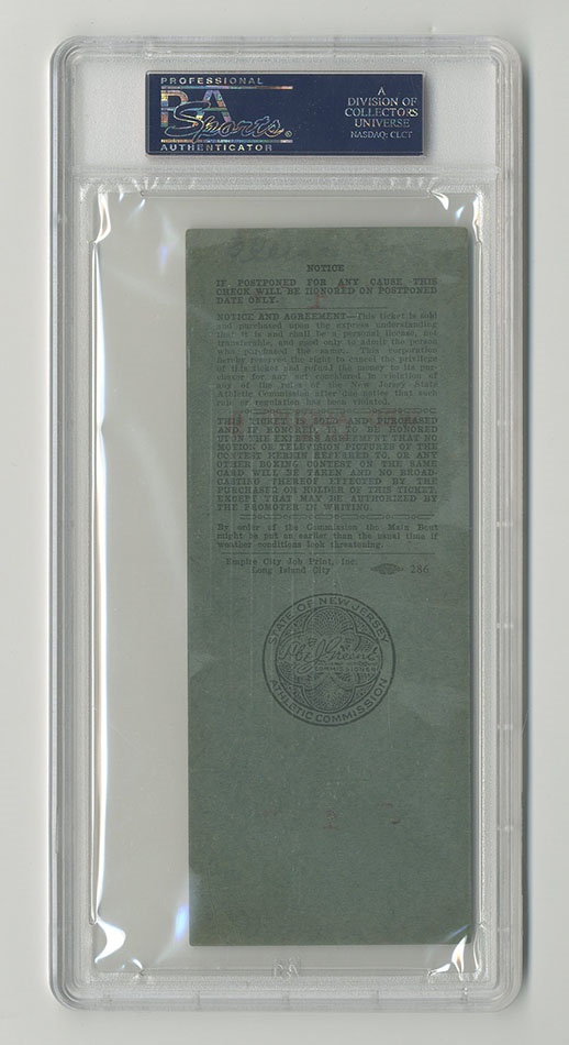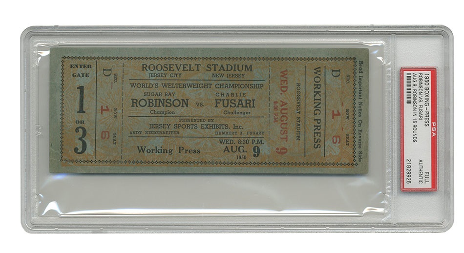 On August 9, 1950 at Roosevelt Stadium in Jersey City, New Jersey World Welterweight Champion Sugar Ray Robinson defended his title against tough Charley Fusari, Robinson successfully defended his crown winning a unanimous 15 round decision. Offered here is a very rare, original, full, unused ticket for this event. This full ticket names the fighters and includes a section, row and seat number. Bold color and print. Stub firmly attached. Clean. Not creased or torn. Overall EX condition. An extremely rare full ticket, the only example we have seen. Authenticated by PSA/DNA.