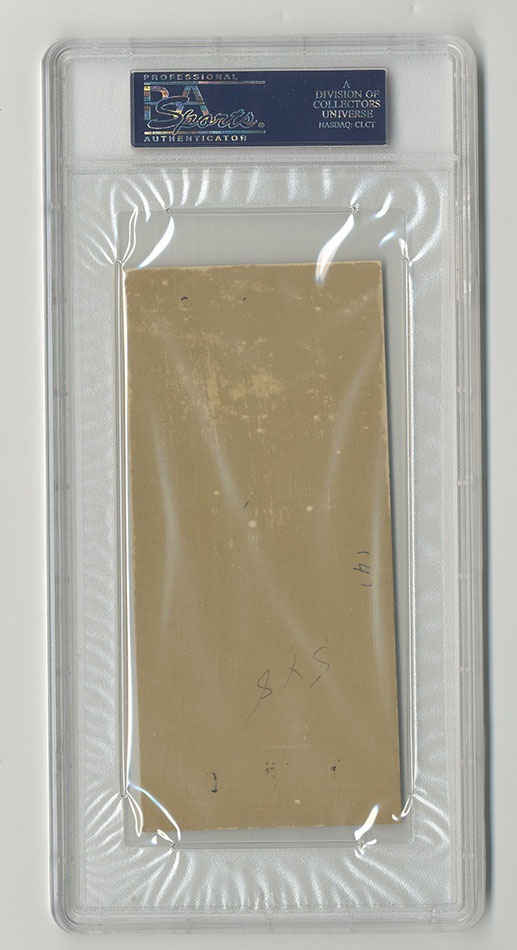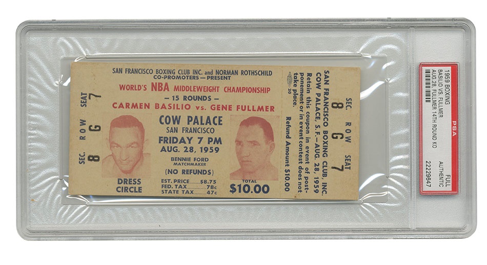 On August 28,1959 at the Cow Palace in San Francisco, California Carmen Basilio fought Gene Fullmer for the vacant World Middleweight Title. Fullmer proved too strong for Basilio and won the bout by TKO in 14 rounds. Presented here is an original, full, unused ticket for this event. This full ticket names and pictures both fighters and includes a section, row and seat number. Bold color and print with bold, clear images. Clean and not creased. Minor edge and surface wear. Overall EX condition. Authenticated by PSA/DNA.
