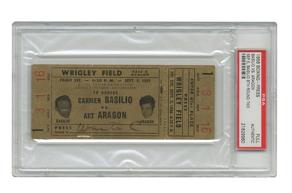 On September 5, 1958 at Wrigley Field in Los Angeles former world welterweight and middleweight champion Carmen Basilio fought Art Aragon in the main event. Basilio prevailed stopping Aragon in the 8th round. Offered here is an original, full, unused ticket for this event. This full ticket names and pictures both fighters and includes a section, row and seat number. Overall VG condition. Authenticated by PSA/DNA.