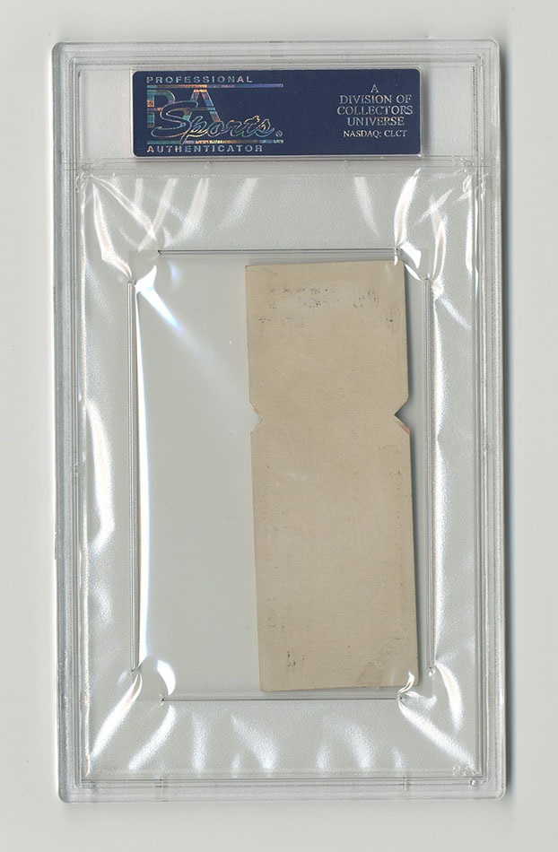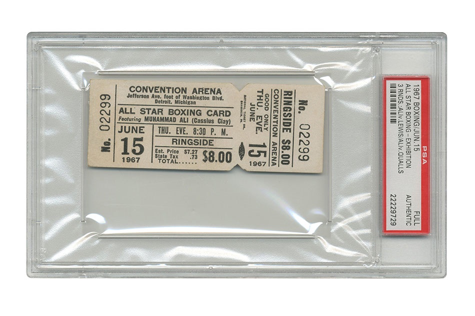 On June 15, 1967 world heavyweight champion fought an exhibition fight for which we offer a very rare full ticket. Ali had fought his last title defense in February, 1967 against Ernie Terrell and was now embroiled in a legal fight with the government that would result in his forced retirement for three years. During that period Ali earned a living making speeches, acting and through personal appearances. At the time of this exhibition, one of his last ring appearances during this three year period Ali was still able to earn a living fighting. This is a rare, full, unused ticket which names Ali and has a section, row and seat number. Bold color with no creasing and clean. Authenticated by PSA/DNA. The only example we have seen.