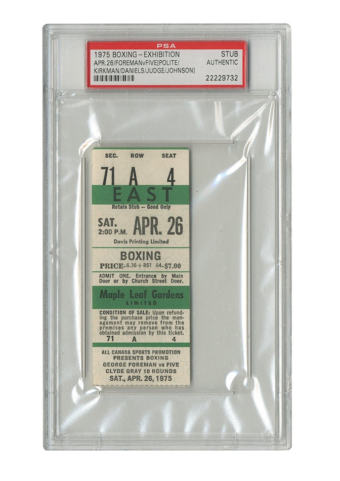 On April 26, 1975 at the Toronto Maple Leaf Gardens former heavyweight champion George Foreman in an attempt to demonstrate his invincibility after his loss to Muhammad Ali took on five different opponents on the same show. Howard Cosell presented the event as a farce, and the presence of Ali at ringside incensed Foreman, as typical Ali relentlessly taunted Foreman throughout his 5 bouts, at one point yelling to George, “You can whip these five men, but you can’t whip no one me!” Ali succeeded in stealing the show, focusing both the crowd’s and Foreman’s attention on himself, rather than the event. Offered here is a full, unused ticket for the fight. EX condition. PSA/DNA authenticated, but erred in calling ticket a stub. It is full.