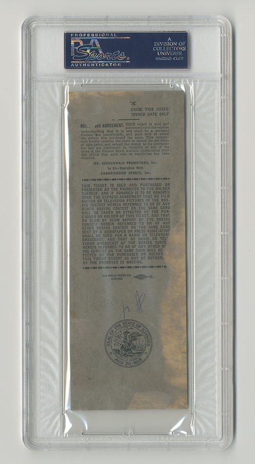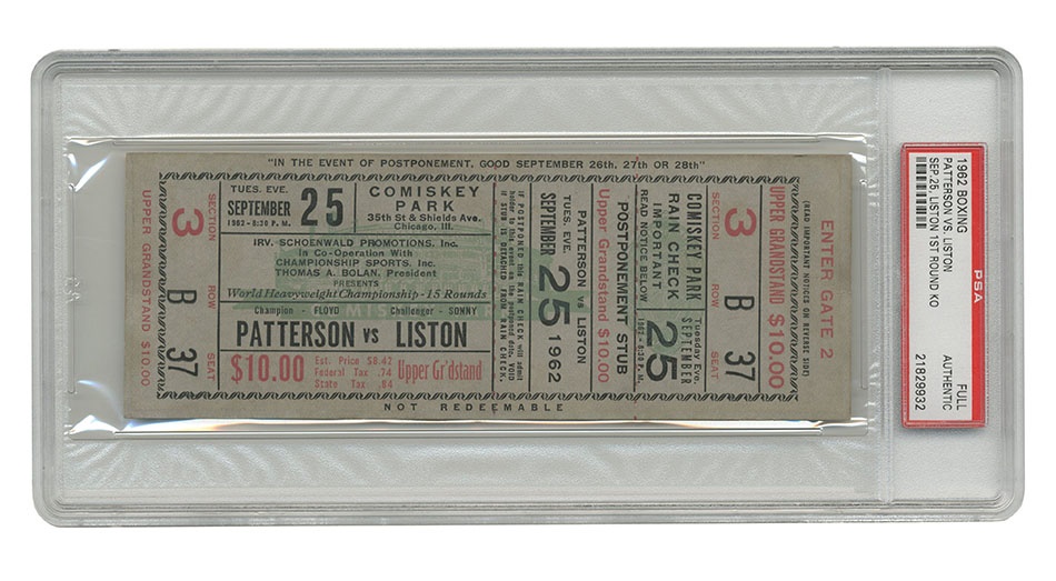 On September 25, 1962 at Comiskey Park in Chicago Floyd Patterson defended his heavyweight tile against the number one contender Sonny Liston. Liston waited a long time for his shot and made the most of it stopping Patterson in the very first round to win the title. Offered here is an original, full, unused ticket for this event. This full ticket names both fighters, the date and venue and includes a section, row and seat number. Bold color and print. Ticket has some soiling and mild creasing. Overall VG condition. Authenticated by PSA/DNA.