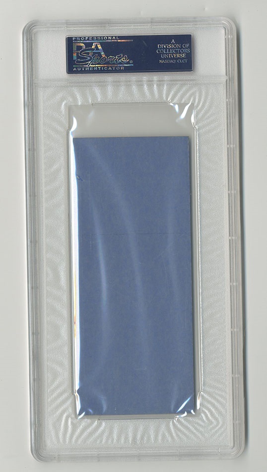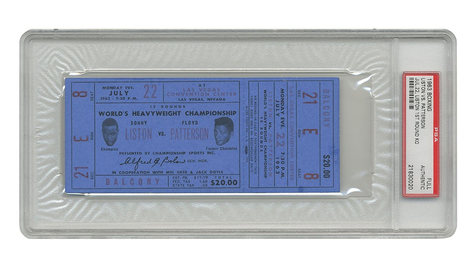On July 22, 1963 at the Convention Center in Las Vegas heavyweight champion Sonny Liston defended his title against the man he won it from the year before, Floyd Patterson. The result was the same. Patterson was knocked down three times in the first round before being stopped for good. Offered here is a scarce original, full, unused ticket to this fight. This original, full, unused ticket pictures both fighters. Bold color and print. Bold, clear image. Stub attached. Not creased or torn. Generally clean. Minor edge and surface wear. 2 1/2" x 6." Ticket is not readily seen. Authenticated by PSA/DNA.
