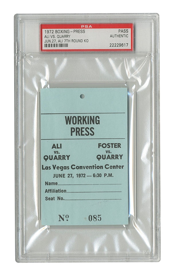 On June 27, 1972 at the Convention Center in Las Vegas heavyweights Muhammad Ali and Jerry Quarry battled for Ali's NABF Heavyweight Title. Ali prevailed stopping Quarry in the 7th round. Offered here is an original Worker's Pass for this event. This Pass names the fighters and date. It was used to gain access to the arena and the locker rooms during the event. Bold color and print. Clean. The Pass is not creased and exhibits only minor edge and surface wear. Overall EX condition. Exceptionally rare, the only example we have seen. Authenticated by PSA/DNA.