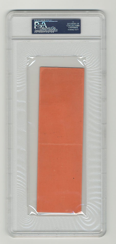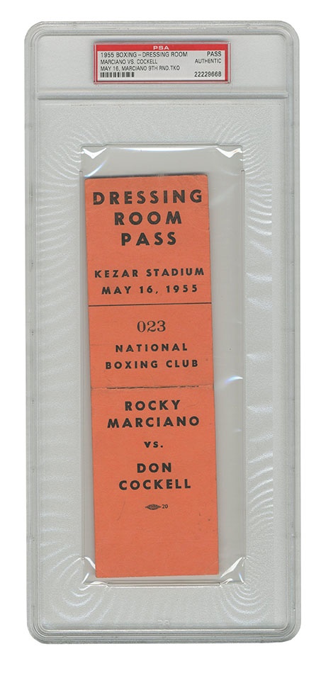 On May 16, 1955 World Heavyweight Champion, Rocky Marciano, defended his title against Don Cockell in San Francisco. Marciano battered Cockell from start to finish en route to a stoppage in the 9th round. Presented here is a rare, original, full, Dressing Room Pass for this event. This complete Pass exhibits minor soiling and slight edge wear. Overall EX condition. Authenticated by PSA/DNA.