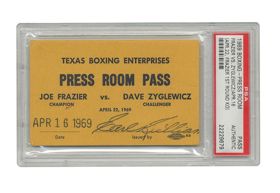 On April 22,1969 Joe Frazier met Dave Zyglewicz in a Heavyweight Championship bout at the Houston Coliseum in Houston, Texas. Frazier won the bout by a 1st round KO in a dominant effort. Offered here is an original Press Pass for this event. This rare Press Pass names the fighters. Bold color and print. Not creased or torn. Clean. Minor edge and corner wear. Overall EX condition. Authenticated by PSA/DNA. Any tickets or passes from this championship event are rare.