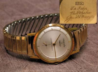 Amazing gift from one superstar Hall of Famer to another. Inscription on the back of this eighteen-karat gold Impala by Aureole watch is the Yankee Clipper's handwriting and signa-ture in facsimile, reading, "To John, Best Wishes, Joe DiMaggio." The watch has not been used, and keeps time perfect-ly. Original band. One of the most intriguing pieces in the auction, as the star power is in duplicate.