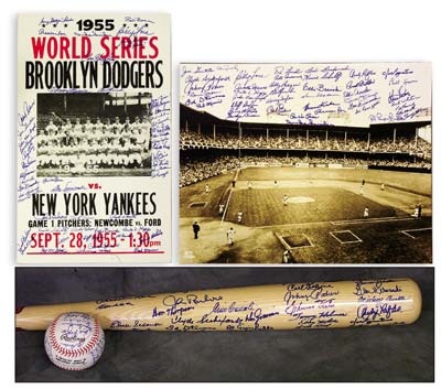 All the Bums that were fit to print (or sign, actually). 1) Former Dodgers signed ONL (Coleman) baseball with thirty-two signatures including Snider, Pafko, Newcombe, Roe and more. 2) Cooperstown Collection Dodgers signed bat (34") with over forty signatures including Roe, Podres, Erskine, Zimmer, Pafko, Owen and more. 3) Large (16x20") Ebbets Field Dodgers signed photograph with eighty-eight signatures including Reese, Snider, Erskine, Podres, Labine, Loes, Craig, Roebuck and more. 4) 1955 World Series replica poster (14x22") signed by more than fifty Dodgers including Reese, Snider, Newcombe, Erskine, Shuba, Sukeforth and more.