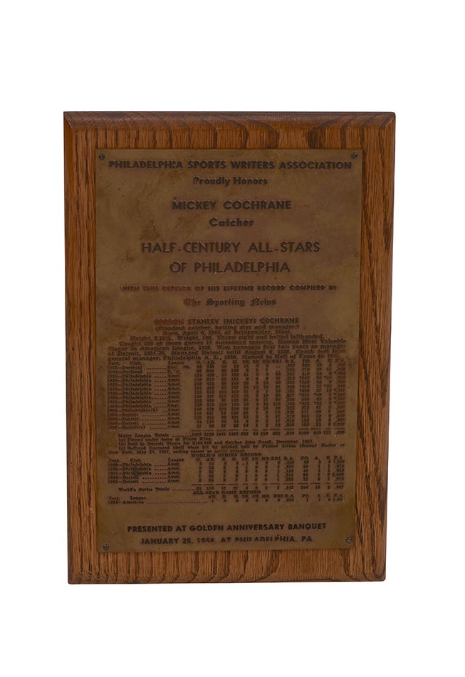 Sixteen years after calling it a career, catching great Mickey Cochrane received this esteemed honor from the Philadelphia Sports writers Association naming the former Athletics star as a "Half-Century All-Star of Philadelphia." The wood-based plaque includes a replica of his lifetime stats - highlighted by a .320 career batting average - on the metal face. It was presented to Mickey at the Philadelphia Golden Anniversary banquet in 1954 and remains in EX condition.