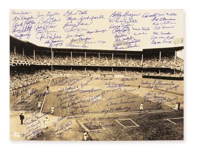 About ninety(!) perfect blue sharpie signatures on this giant and beautiful shot of Ebbets Field. That's more bums than a Times Square soup kitchen! Notables include Roe, Sukeforth, Snider, Reese, Erskine, Podres, Hopp and dozens more. Frame this one up and treasure it. You'll never find more Brooklyn Dodgers in one place. 16x20".