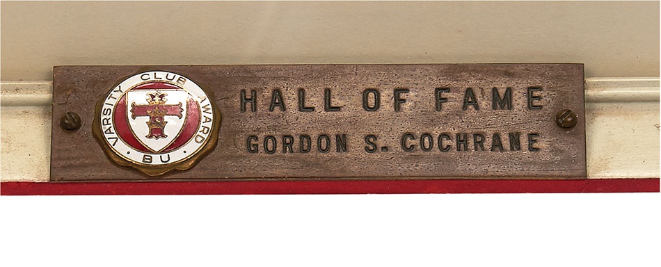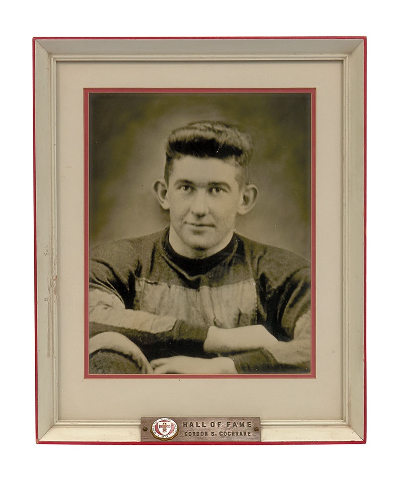 Mickey Cochrane's identity is almost exclusively tied into baseball, but the Hall of Fame catcher was also a great football player. So much so that he had to choose which sport to pursue professionally upon graduation from Boston University. This vintage framed photo of Mickey in his BU football uniform has a plaque at the bottom with the school's Varsity Club logo and the engraving: "HALL OF FAME GORDON S. COCHRANE." It was presented to him by the school when he was inducted into its sports Hall of Fame. It's in VG condition with an easel back.