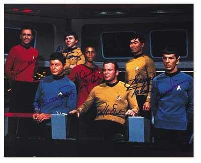 A smashing line-up of the Enterprise posed on the bridge, including Leonard Nimoy (Spock), William Shatner (Kirk), James Doohan (Scotty), Nichelle Nichols (Uhura), Walter Koenig (Chekov), George Takei (Sulu), and the sadly deceased DeForest Kelly (Bones). All sig-natures are in perfect blue sharpie. Mint. LOA from Scoreboard who did the original signing with the entire crew.