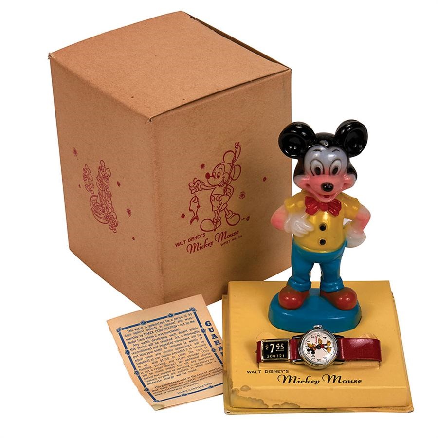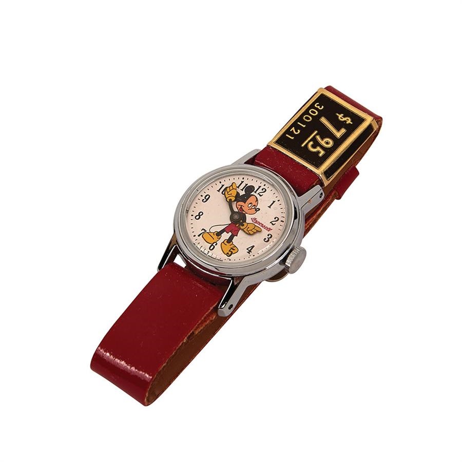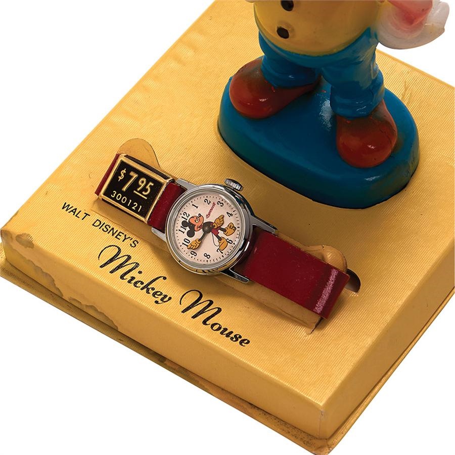 Beautiful watch has never been touched. Great plastic standing Mickey Mouse adorns the display and stands 5.5" tall. Original paper tag, guarantee and slipcase making it 100% complete. Few minor spots of water staining otherwise NRMT and boxed.