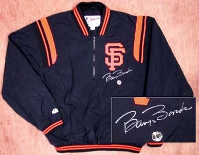 Lightweight pull-over jacket kept this future HOF'er warm as he powered his way into immortality. "SF" logo in orange over heart has perfect silver sharpie signature just below. Collar tagging is from "Majestic Athletic [size] XL," with "25 Bonds" in black marker across it. Authenticating holographic sticker is from Bonds him-self, as is the patch stitched into the lining inside. Light but definite use.