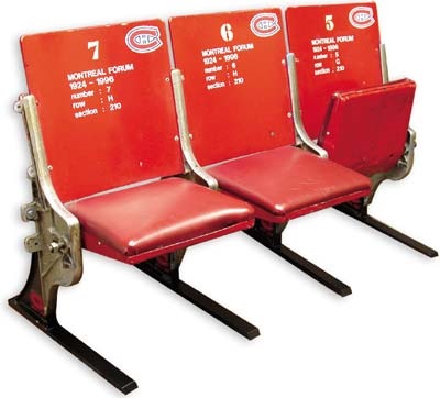Row of three vintage red riser-mount chairs from the fabled Forum in Montreal. Seats 5,6 and 7 (Morenz) with original numbers and paint. Applied decal reads "Montreal Forum, 1924 -1996" and lists the original sec-tion, row and seat numbers. Original sides attached to newly cast floor mounts and feet. Habs history!