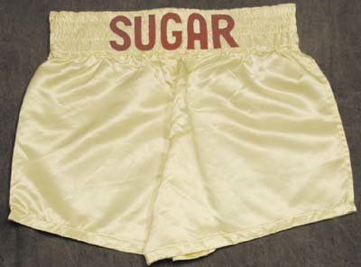 Check old fight photos and you'll certainly be able to figure out the exact bout in which Sugar Ray wore these fine white satin trunks with "Sugar" across the waistband. With boxing memorabilia becoming more popular by the day to top collec-tors, any investment in pugilistic artifacts is certain to be a wise one. It probably wouldn't be a bad idea to track Leonard down and get him to sign these trunks for you too.