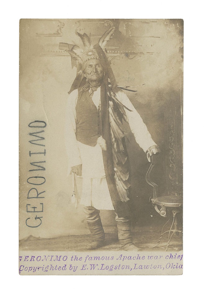Postcard itself is amazing, showing "Geronimo, the famous Apache War Chief Copyrighted by E.W. Logston Lawton, Okla." Pencil signature in the Geronimo style is not him but is vintage. Unposted NM.