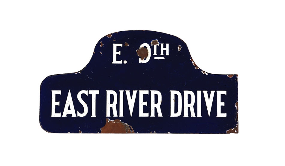 Once known as the East River Drive, it is now known simply as the FDR. This is the original, double-sided New York City sign from 1934 at the 9th street intersection. Measures 21.25" x 11.75". There is some chipping.