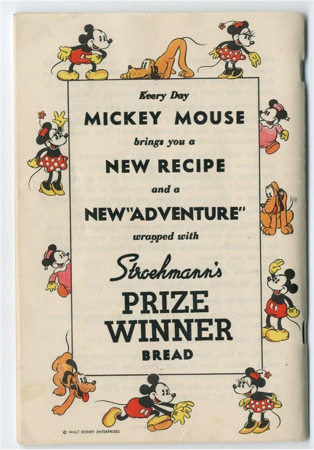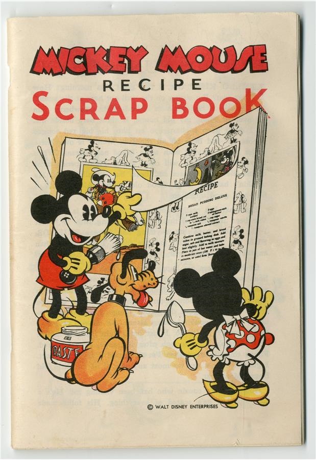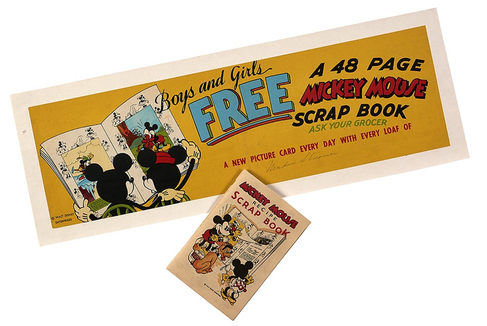 The poster is from the famed Disney Bread Label Find that changed the life of the Evans family and essentially funded the growth of Lelands.com over 25 years ago. Linen-mounted in fabulous full color featuring Mickey and Minnie looking at their bread end labels "Scrap Book." This is a 20" x 6" "window streamer" with that notation written in ink on the poster way back when as this was the one and only "File Copy." Comes with the scrapbook itself as well with 15 of these tough to find bread cards affixed and not. Some have a small tear and back damage, but literally a throw-in with this awesome poster, which is NRMT.