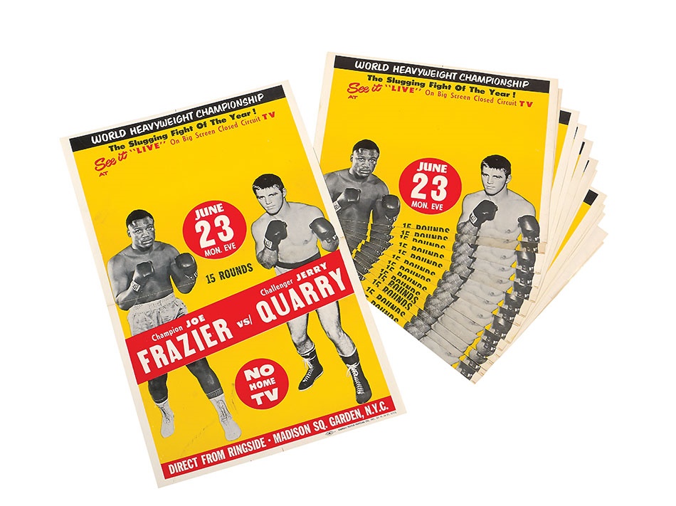On June 23,1969, Joe Frazier met Jerry Quarry for the NYSAC Heavyweight title. Frazier won the bout by TKO in the 7th round. Presented here are 14 original closed-circuit posters advertising the viewing of this fight on the big screen. These paper posters picture the fighters. The posters have great graphics with bold color and clear images though they exhibit some edge and corner wear, as well as minor soiling. Overall EX condition with original folds. 14" x 22."