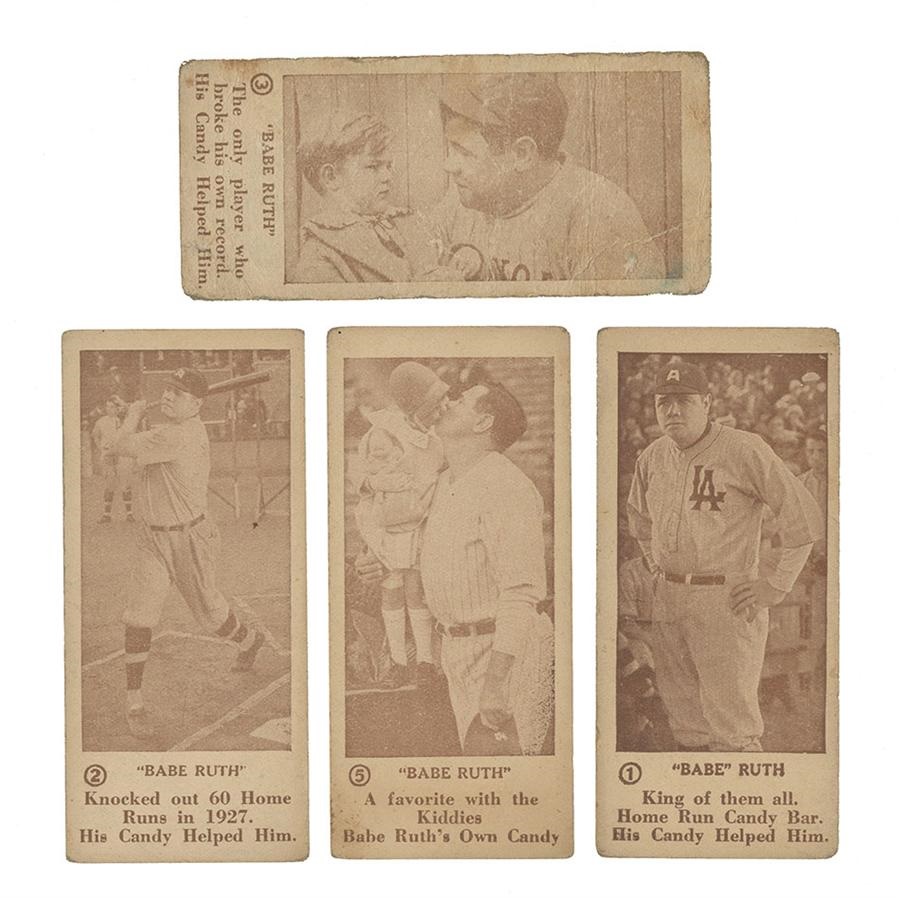 A small but very tough to find issue from 1928 capitalizing on the fame of the legendary Babe Ruth. Cards could be redeemed as a complete set for a baseball signed by Babe Ruth. Included in this group are four of the six cards that all feature the Babe. They grade: #1 VG-EX, #2 EX, #3 GD, #5 VG-EX. All four of these are blank backed.