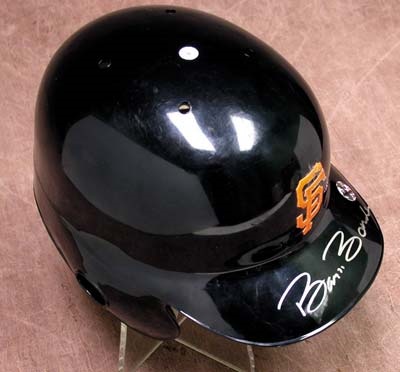 This one has everything you're looking for. Use is light but obvious. "Bonds" sticker in block letters across back. Spectacular silver sharpie signature across visor is authenticated by Bonds' holographic sticker. Inside has all stickers from "Diamond Collection" and "American Cap Co. [size] 7 3/8." Stamped twice, "Purchased from San Francisco Giants." All that's missing is Barry's head.