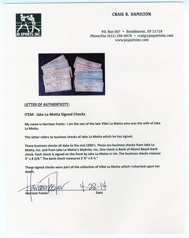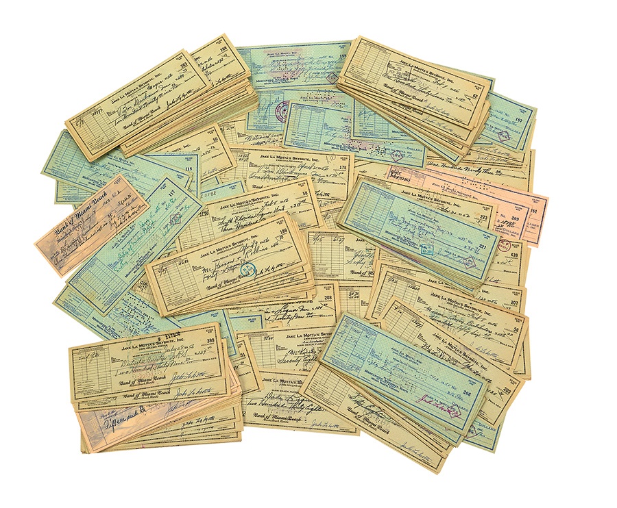 Jake La Motta won the World Middleweight Title on June 16, 1949, stopping Marcel Cerdan in 10 rounds. He posted career victories over Sugar Ray Robinson, Tommy Bell, Fritzie Zivic, and Laurent Dauthuille in compiling a career mark of 83-19-4. Known as "The Bronx Bull," he will forever be remembered as the subject of the critically-acclaimed 1980 movie "Raging Bull." Offered here are a cache of 400 checks, all signed by LaMotta. They all date to the mid 1950s. These are business checks from Jake La Motta, Inc. and from Jake La Motta’s Skybrite, Inc. One is issued from Bank of Miami Beach bank. Each check is signed on the front by La Motta in ink. They measure 3” x 8 3/8.” The bank check measures 2 3/4" x 6 3/4." All are in excellent or better condition with bold signatures. LOA from son of Vikki LaMotta.