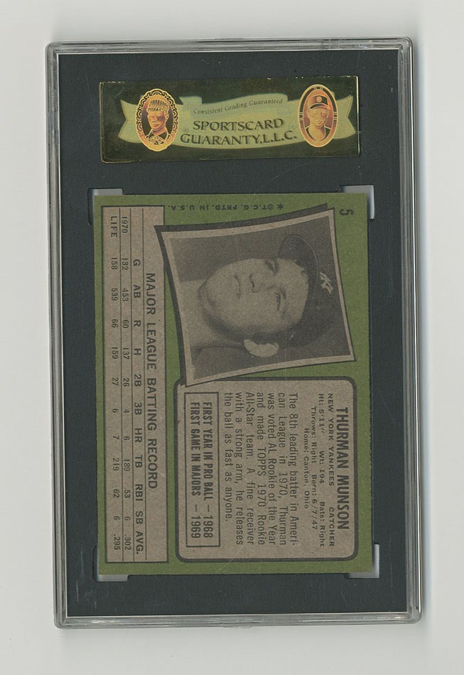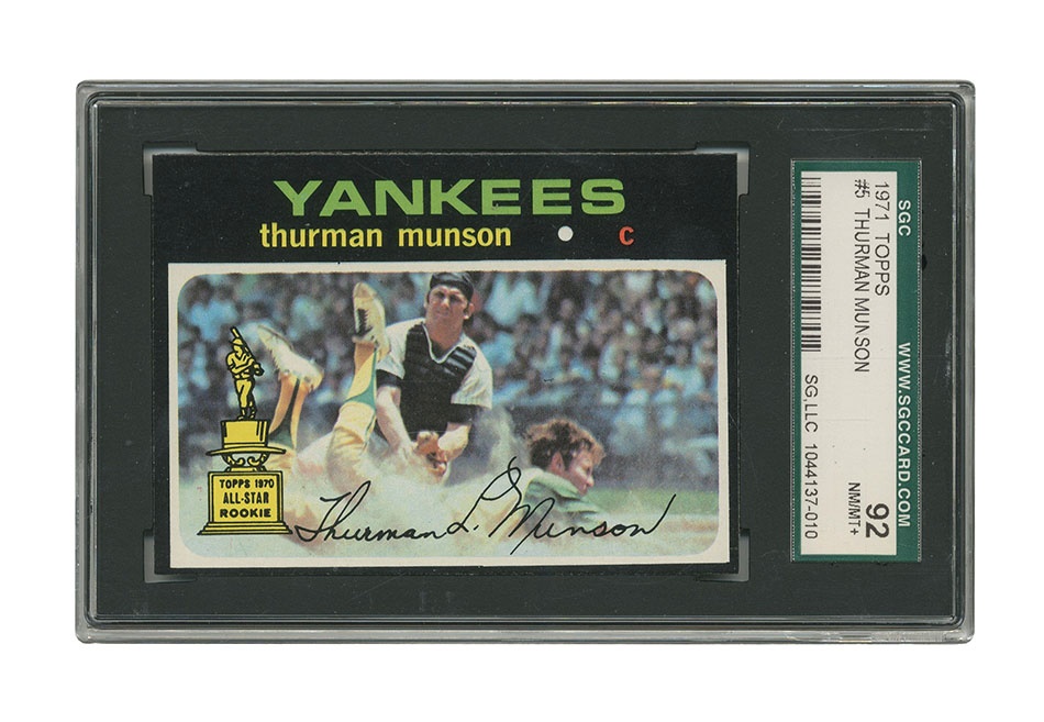 One of our favorite cards... the horizontal pose of a Yankee Captain who defined a legacy. The Rookie of the Year trophy doesn't hurt either, along with Thurman's scrappy play at the plate in this card's indelible graphics. Beautiful condition.