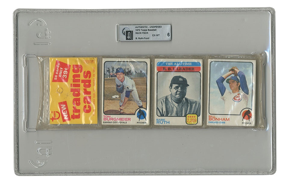 Lot # 679: 1973 Topps Baseball Unopened Rack Pack With Babe Ruth On Top