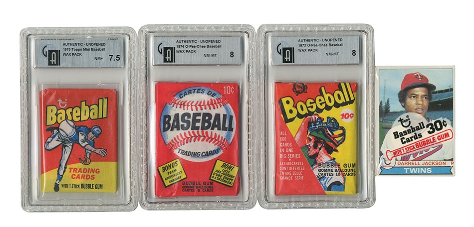 The 1979 cello has a 1" split corner, 1973 is OPC and is a GAI8, and 1974 is an OPC and is a GAI8. This lot has been inspected and authenticated by Steve Hart of Baseball Card Exchange.