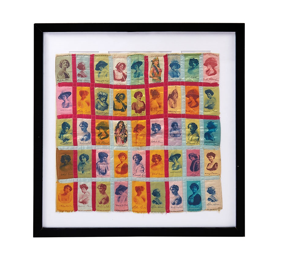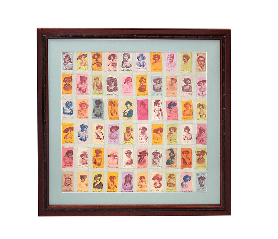 And you thought YOUR linens were old! These two framed silk pillowcases were made folk art crafted over a century ago and feature four baseball players as well as 56 actresses of the time. The ballplayers are: Hal Chase and Harry Wolter of the New York Highlanders, George "Peaches" Graham of the Chicago Cubs and Hooks Wiltse of the New York Giants. Among the actresses of note are matinee marm Louise Dressler and Billie Burke (Mrs. Flo Ziegfeld), most commonly known as Glinda the Good Witch from "The Wizard of Oz." A neat, hand-written list of all the honorees is attached. The frames measure roughly 25" x 25" and 21.5" x 21.5". The silks are in excellent condition.