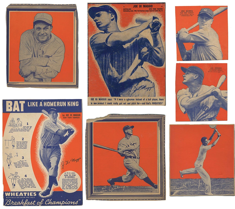 An assortment of Wheaties cards that were removed from cereal boxes throughout the 1930s. Included are Lou Gehrig (2) both trimmed within their borders, Joe DiMaggio (2) EX, VG, Jimmie Foxx, Ellsworth Vines (Tennis) and Joe Vosmik, all trimmed within the borders.