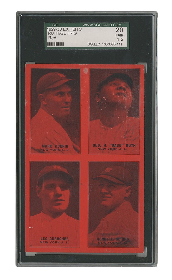 The 32 card 1929-1930 Four-on-One Exhibit baseball card set features four ballplayers from the same team per panel. They came in a variety of color combinations. This red and black combination features both Babe Ruth and Lou Gehrig as well as Leo Durocher and Mark Koenig. It has been Graded SGC 20 Fair 1.5 due to some surface issues.