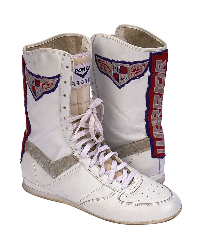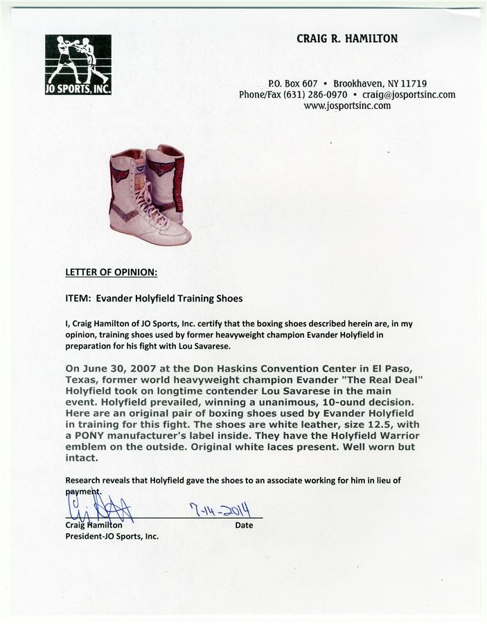 On June 30, 2007 at the Don Haskins Convention Center in El Paso, Texas, former world heavyweight champion Evander "The Real Deal" Holyfield took on longtime contender Lou Savarese in the main event. Holyfield prevailed, winning a unanimous, 10-ound decision. Here are an original pair of boxing shoes used by Evander Holyfield in training for this fight. The shoes are white leather, size 12.5, with a PONY manufacturer's label inside. They have the Holyfield Warrior emblem on the outside. Original white laces present. Well worn but intact. Given by Holyfield to a former associate. Comes with letter from Craig Hamilton of JO Sports, Inc.