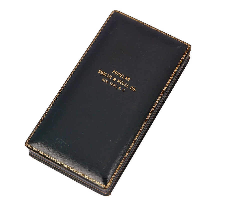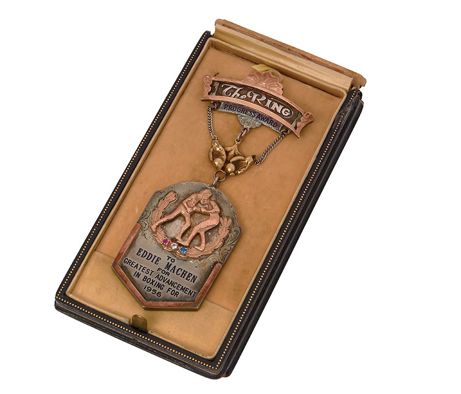 Eddie Machen was a heavyweight boxer who fought during the 1950s and 1960s. During his career, he fought Joe Frazier, Sonny Liston, Ingemar Johansson and others. His career record was 50-11-3 with 29 KOs. Presented here is the 1956 Ring Magazine Progress Award, which was given to Eddie Machen for his efforts to advance boxing. This is a two-piece metal award which reads, "THE RING PROGRESS AWARD TO EDDIE MACHEN FOR GREATEST ADVANCEMENT IN BOXING FOR 1956." Perfectly intact in the original box. The only example of this prestigious award we have seen. 2 1/2" x 5."