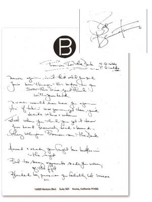 On her personal letterhead Pat penned the words to "Promises In The Dark" and signed it "Pat Benatar '95." An impressive item for one of her devoted followers. Also included is a promotional photograph. NRMT.