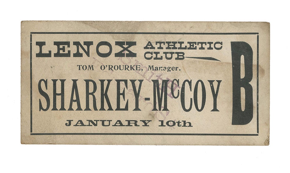 On January 10, 1899 at the Lenox Athletic Club in New York, heavyweights Tom Sharkey and Kid McCoy met in the main event. Sharkey knocked McCoy out in the 10th round. We offer here a full ticket for this event, the smaller of the two versions. The ticket names the fighters, date and venue. The print is bold. Ticket has rounded corners, but not creased with some soiling. 1 3/4" x 4." Rare.