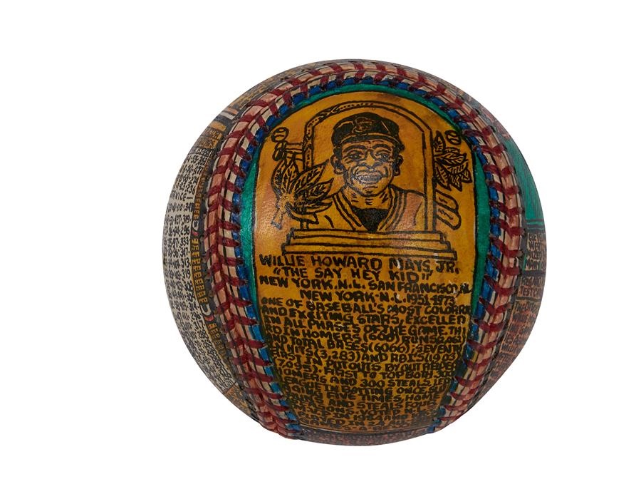 Umpire-turned-artist George Soznak transformed a Willie Mays-signed baseball into another vibrant work of art. This meticulously crafted piece details all of the Hall of Famer's feats and heralds his most famous play - "The Catch" - when Mays ran down Vic Wertz's blast to deep center field at the Polo Grounds during the 1954 World Series, snaring the drive over his shoulder while running at full speed with his back to the plate. Mays' Cooperstown plaque is also reproduced here by Soznak as he fills every possible iota of space on the ball with the exception of Willie's autograph. He even colored the stitches. A tour de force for the eyes, Sosnak's work has grown exponentially through the years in terms of collector respect and price. This is one of his finest pieces as we know. We were the original sellers of the Sosnak Collection, consigned by the family decades ago, and were the first to extoll the virtues of the work of the great George Sosnak.
