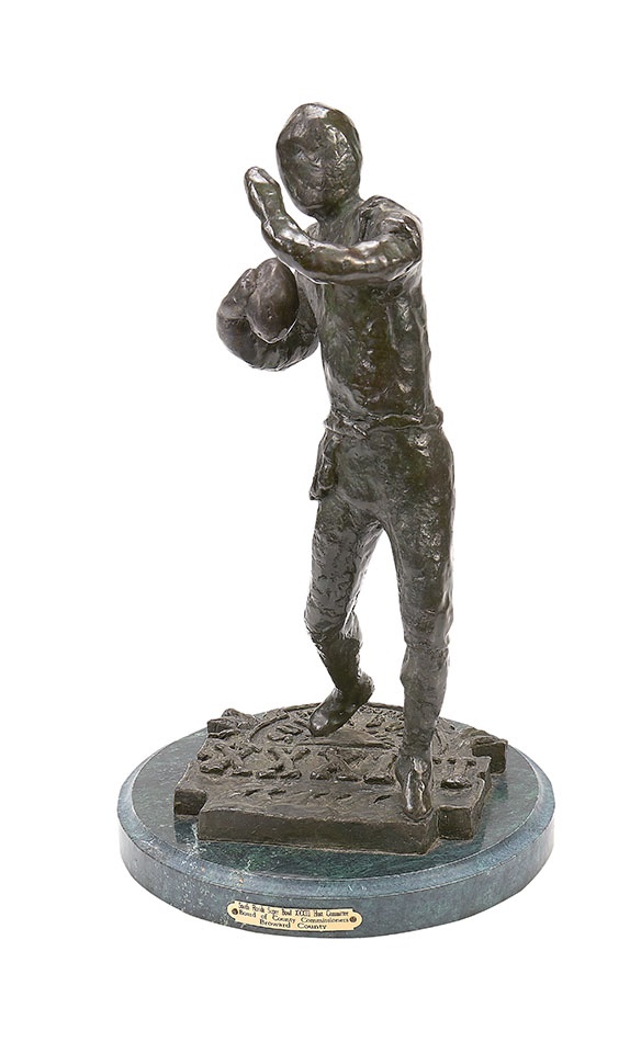 This stately, solid bronze sculpture by noted artist George Gadson was one of approximately 100 presented to owners and key sponsors of Super Bowl XXXIII played in Miami on January 31, 1999 and won by the Denver Broncos, 34-19, over the Atlanta Falcons. It is an abstract image of a quarterback throwing a pass with the Super Bowl XXXIII logo carved into the bottom of the bronze. There's a small plaque on the green marble base of the statuette which reads: "SOUTH FLORIDA SUPER BOWL XXXIII HOST COMMITTEE BOARD OF COUNTY COMMISSIONERS BROWARD COUNTY." It measures approximately 10.5" wide and 17" tall and is an impressive work of art.
