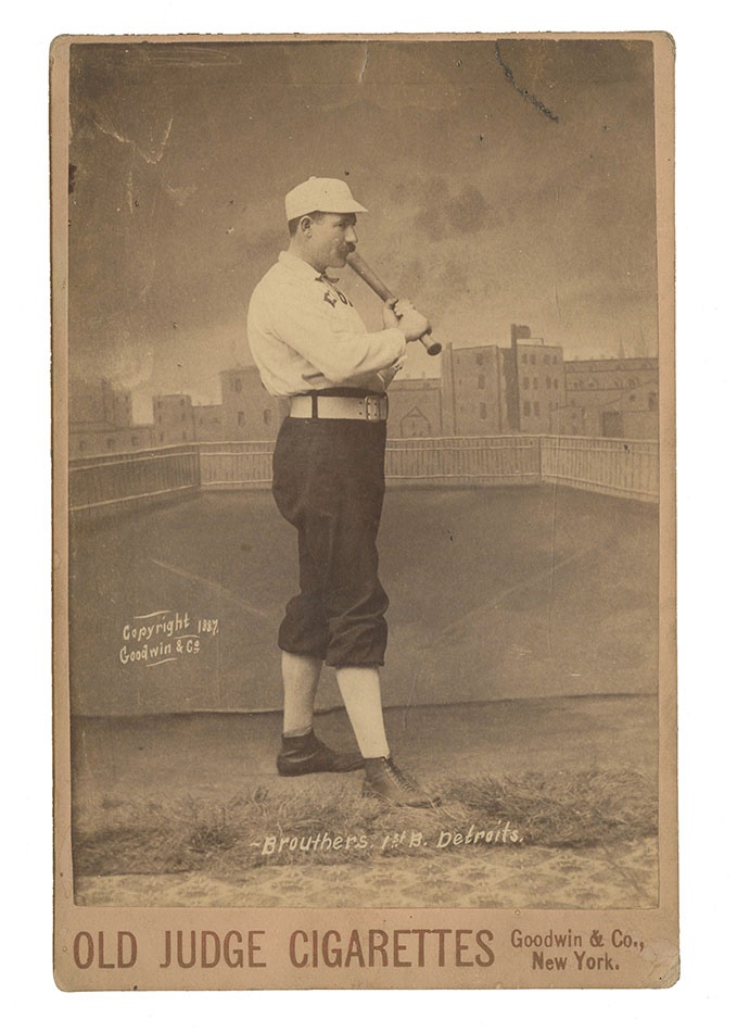 Beautiful card from this hallowed series of cabinet photographs gum baseball cards. Only available as premiums, the Old Judge Cabinets took a lot of cigarettes to smoke and increased the danger of lung cancer. People literally gave their lives for these cards. This is of preeminent Hall of Famer Dan Brouthers, one of the best of his era. This is A1 condition for this issue. Mount grades a strong EX+ with very strong photographic image. This is fresh to our coffers, having rested in an old-time baseball collection for more years than they would like to admit. Its only defect is a tiny tear to the photo that occurred at the factory and has been laid down by them onto the mount.