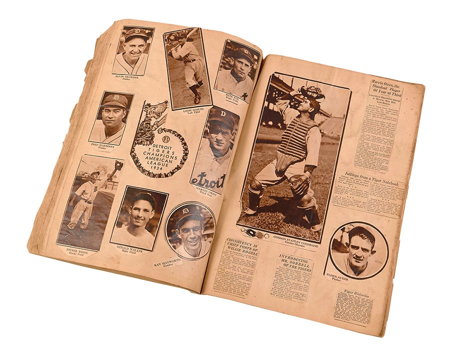 A time-capsule snapshot of a baseball life in the 1930s is what you'll get in these two meticulously compiled albums from the family of Mickey Cochrane family. Contained inside the hundreds of yellowed pages are myriad news clippings, photos and articles relating to Mickey and his teammates. Considering their age, these collections are in Very Good condition with some loose articles also included. Cochrane was a lifetime .320 hitter over his 13-year Hall of Fame career with the Philadelphia A's and Detroit Tigers, so there was plenty of material from which to compile several scrapbooks.