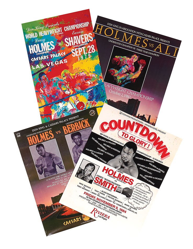 Four scarce on-site posters from the glorious championship run of the "Easton Assassin" - Larry Holmes. This group includes: Ali-Holmes (1980-EX), Holmes-Shavers (1979-EX), Holmes-Berbick (1981-EX), and Holmes-Smith (1984-EX). All four exhibit bold color with clear images and are generally clean. Minor edge and corner wear. A scarce group of posters for this great champion.