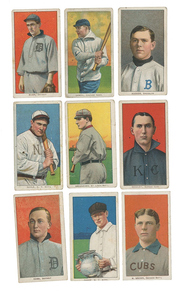 Small 10-card collection of T206 cards features a Ty Cobb Red Portrait that has an interesting bit of factory color loss to the background. The key cards grade: Ty Cobb VG, Mordecai Brown VG, Hal Chase Holding Trophy VG-EX, Roger Bresnahan VG, Chick Gandil VG. The other five break down as 3 VG and 2 PR.