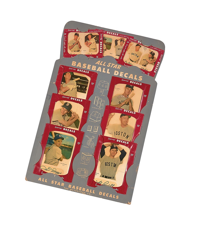 This wonderful display piece includes the original heavy cardboard store display card measuring 13" x 21". In the appointed slots are nine Star-Cal Decals in overall VG-EX condition. The Ted Williams decals are in GD-VG condition yet look great in this visually enticing, point-of-purchase display.