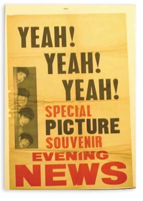 Yeah! Yeah! Yeah! This British newsstand broadside poster announces a Special Picture Souvenir of The Beatles in The Evening News. Used and worn from display, still a strong VG. Extremely rare. 19x30".