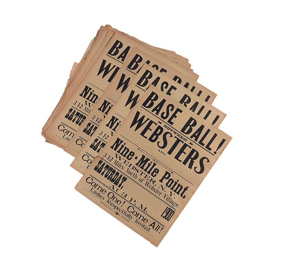 From the turn of the century come these broadsides from the Spinning Print company trumpeting an amateur baseball extravaganza in Upstate New York. Measuring 21" x 28" and a bit yellowed with age, the posters are in very good shape. They read: "BASE BALL! BETWEEN WEBSTERS AND (no opponent listed) AT NINE-MILE POINT WEBSTER, N.Y. 3 1-2 MILES NORTH OF WEBSTER VILLAGE." SATURDAY (no date listed) 1900 AT 3 P.M. COME ONE! COME ALL! LADIES RESPECTFULLY INVITED." Each sheet is identical and features the Spinning Print name and union label at the bottom of the sheet. Webster, NY is a suburb of Rochester, in the Western area of the state. The broadsides have some minor tears here and there but are o/w EX+.