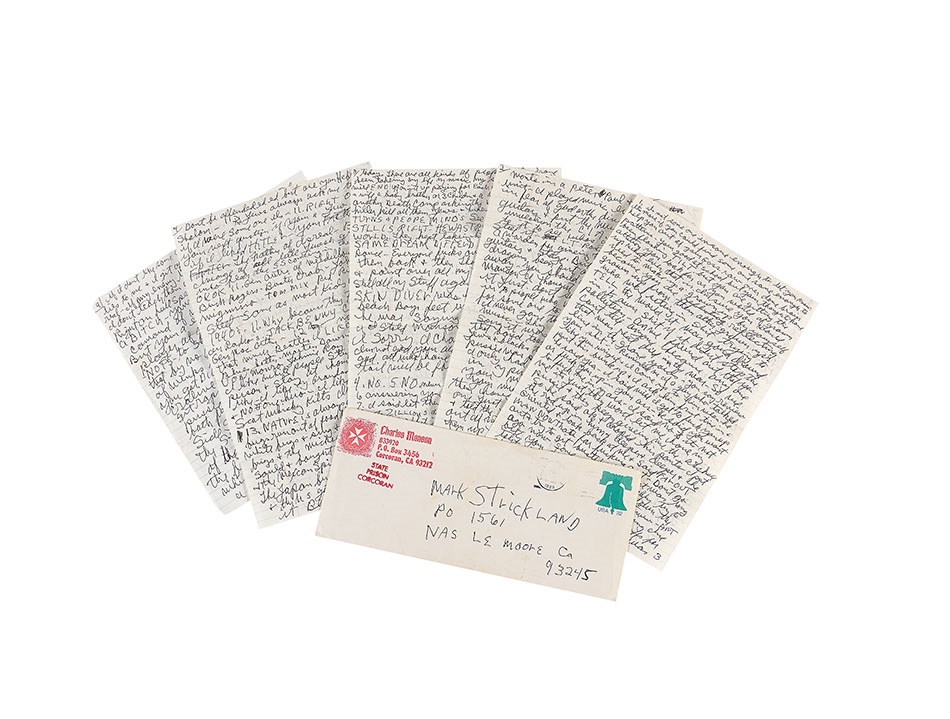 Straight from the mind and pen of a madman comes this screed from one of the most dangerous men of the 20th Century - Charles Manson. Unsigned and handwritten in black ballpoint pen, the nine-page letter to an unknown recipient retains its original envelope from 1995. The failed musician and criminal architect of seven murders in the late 1960s rambles on about Hitler, the death of Brian Wilson and his music among other topics. It is written on both sides of five pages, with the last side being the letter to which he's responding, with that person's name torn off. Otherwise, it is in fine condition. This is typical Manson insanity: narcissistic, preachy and crude, with numerous spelling, syntax and grammatical errors. Also included is a photocopy of another long-winded Manson letter and interview.